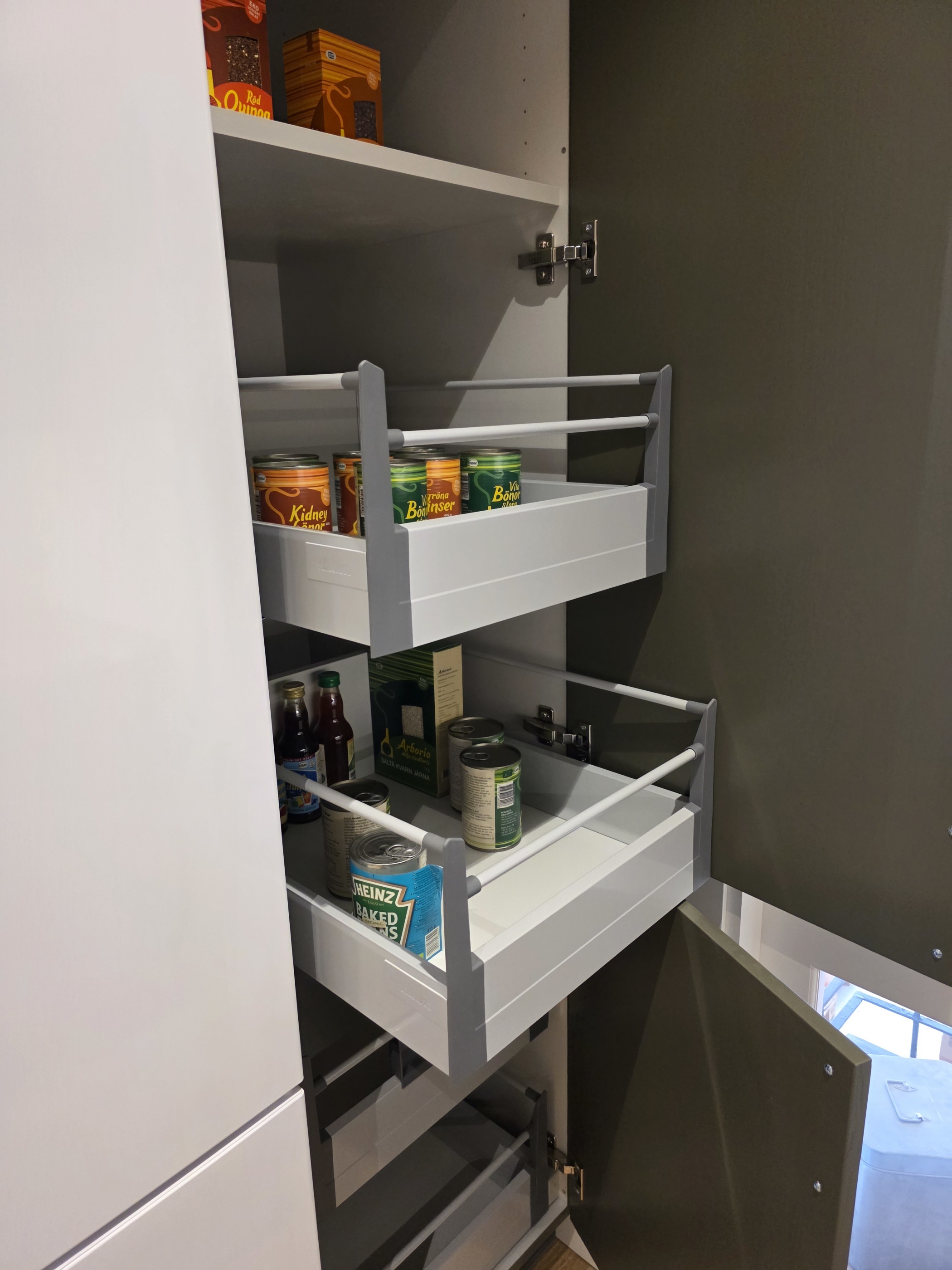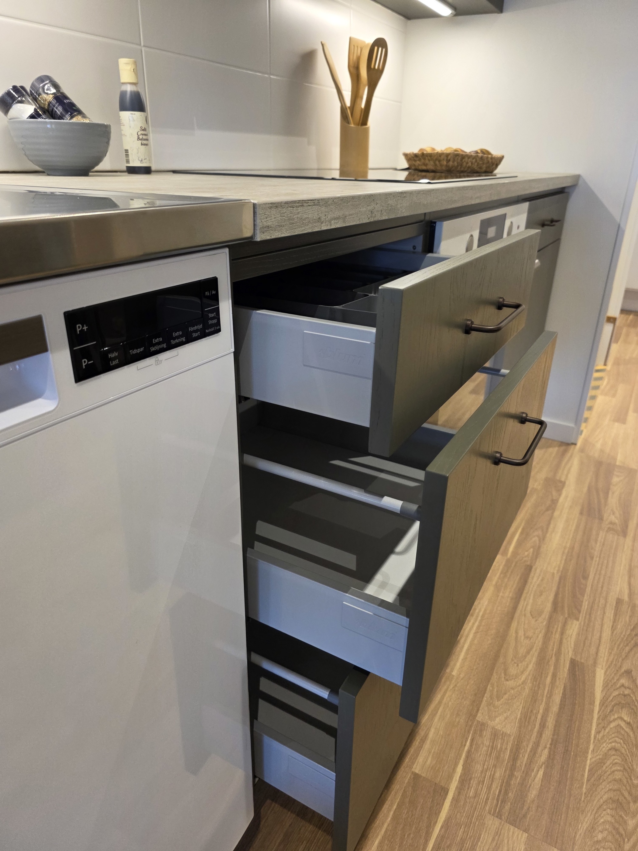 Lådor och grytvagnar har grå plåtsidor och botten av melamin.